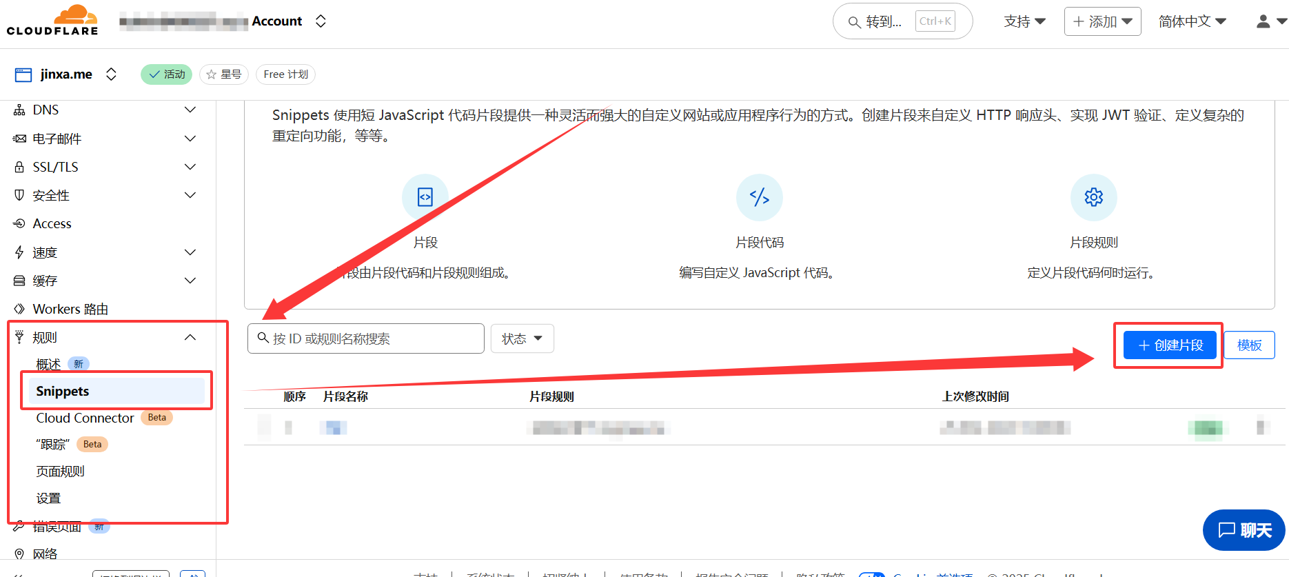 前往 CF 域名管理页面,选择一个具备Snippets功能的域名,点击左侧的规则(Rules) > Snippets > 创建片段。