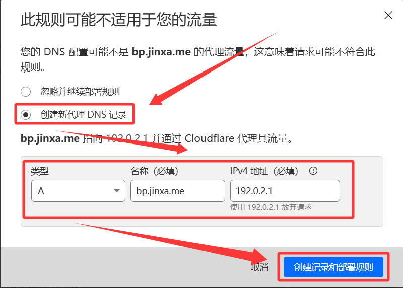 A> 名称你的自定义域名> IPv4地址192.0.2.1> 创建记录和部署规则