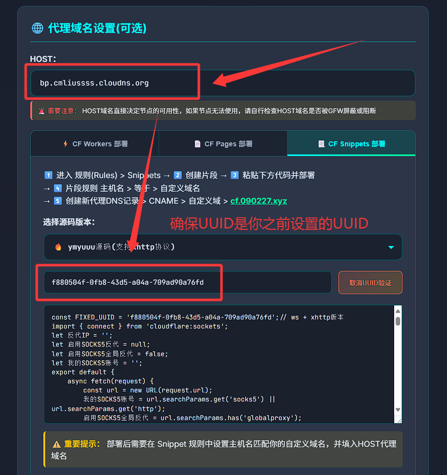前往 BPSUB 网站 ,点击 CF Snippets 部署,选择你心仪的源码并点击 生成UUID验证 。